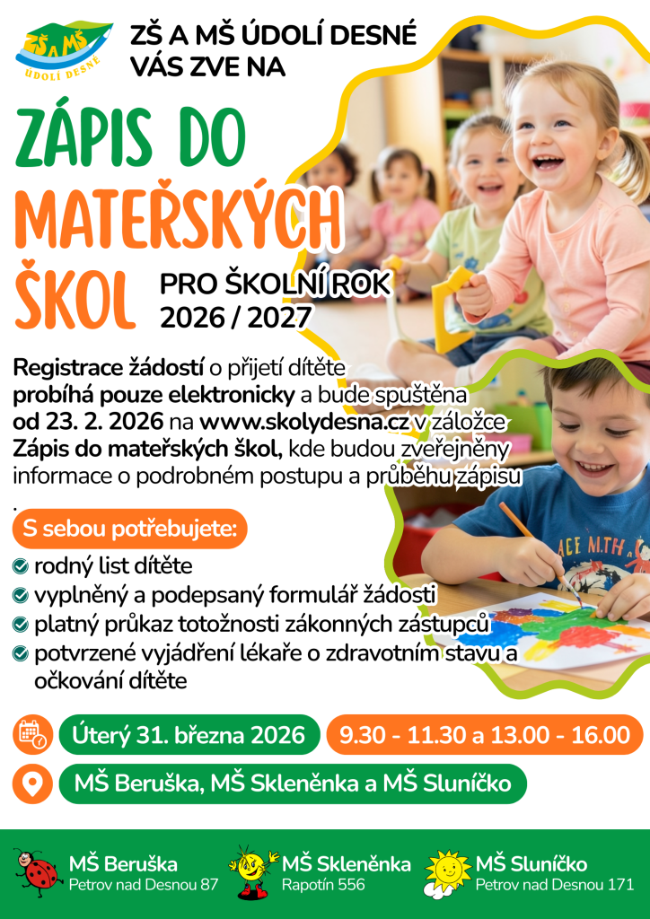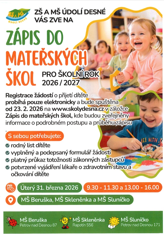 Zápis do MŠ pro školní rok 2026-2027.jpg Typ: JPG obrázek, Velikost: 277.16 kBInformace k zápisu do MŠ 2026-2027.docx Typ: DOCX dokument, Velikost: 19.22 kB