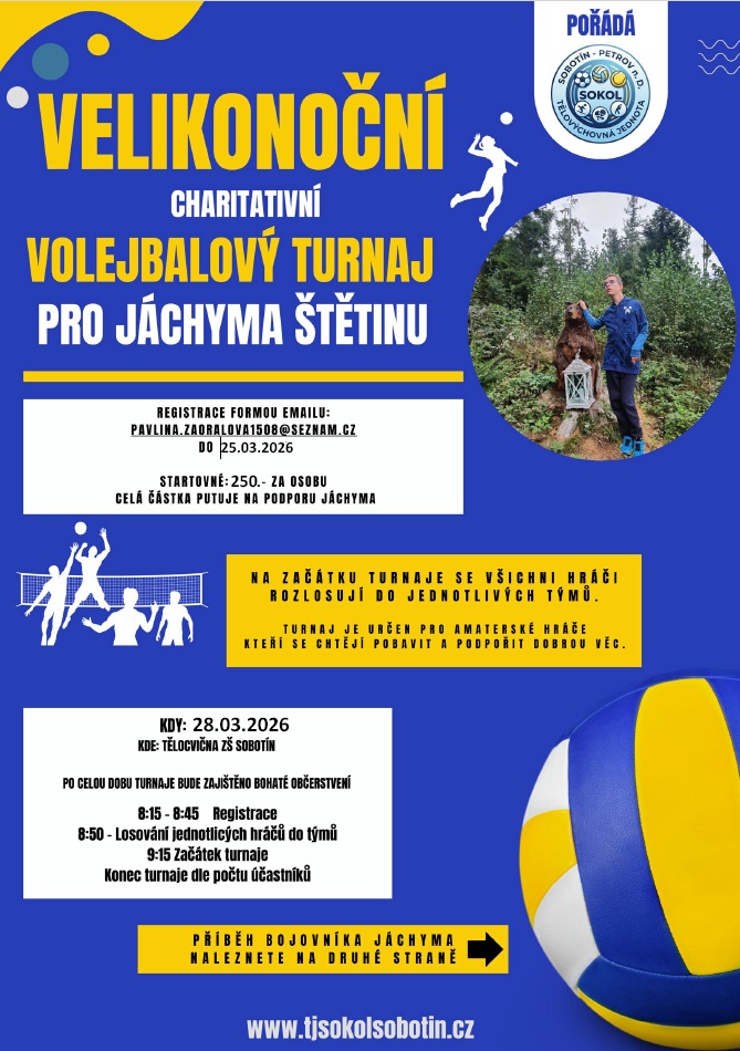 TJ Sokol Sobotín - Petrov n.D., pořádá 28.3.2026 Velikonoční charitativní volejbalový turnaj pro Jáchyma Štětinu. Turnaj proběhne v tělocvičně ZŠ Sobotín.